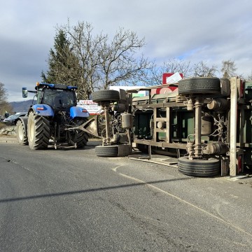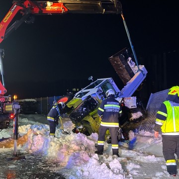Während Schneeräumarbeiten kippte ein Teleskoplader auf einem Firmengelände in Hasendorf an der Mur um und musste mithilfe des Krans des SRF sowie des HLF 1 geborgen werden.