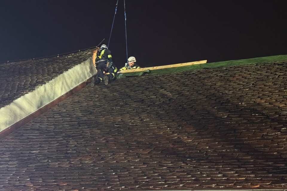Das Dach sowie der Dachstuhl konnten schließlich gesichert werden. Ein Dank gilt allen eingesetzten Kräften für die gute Zusammenarbeit.